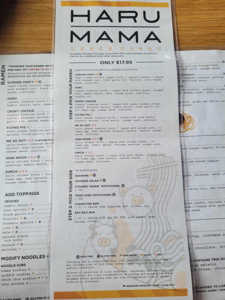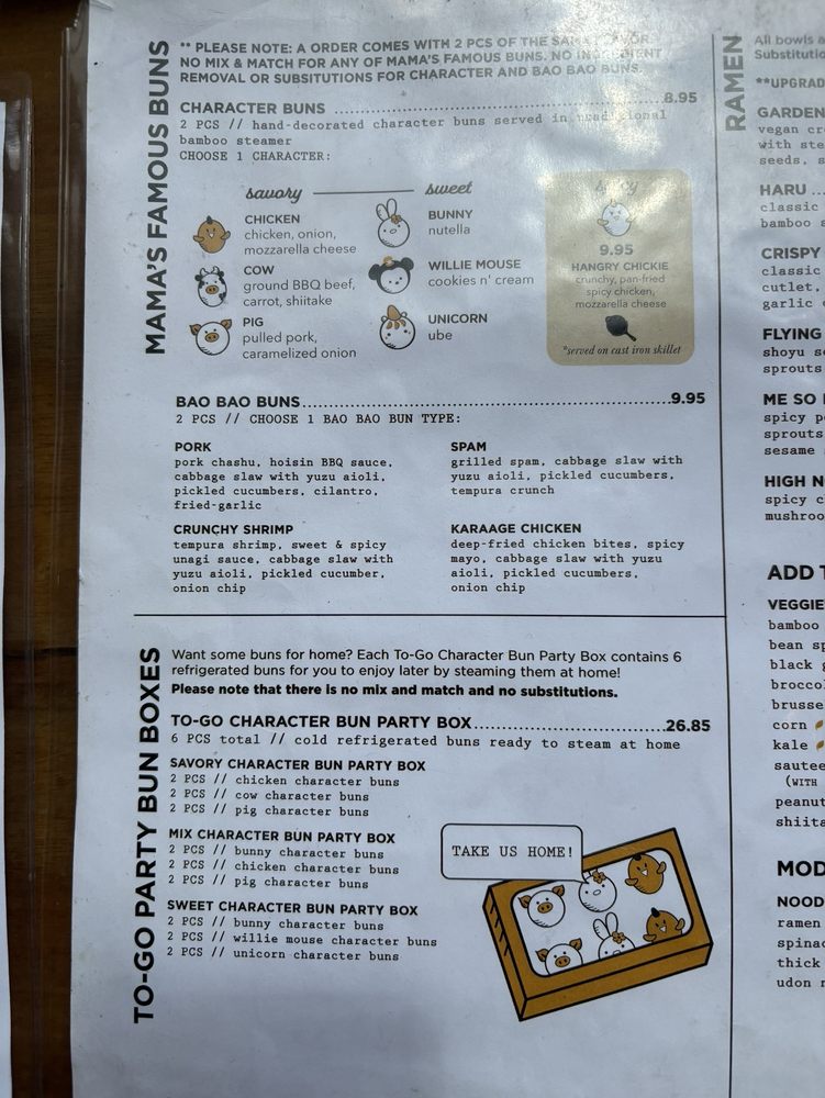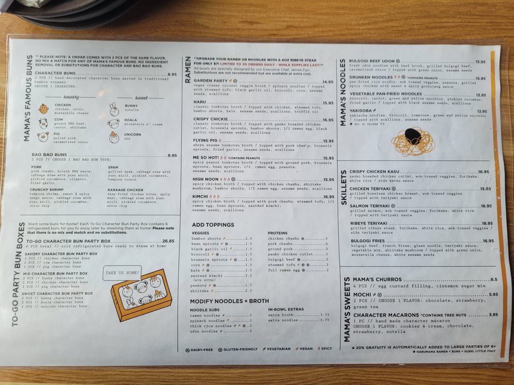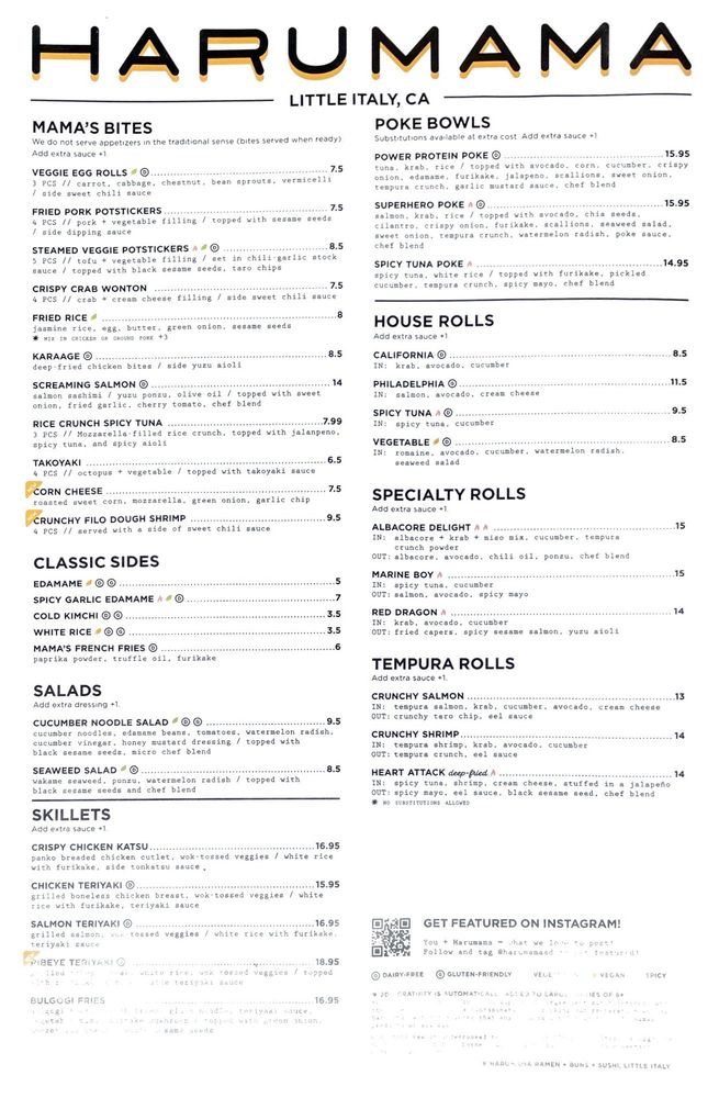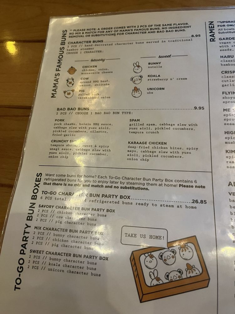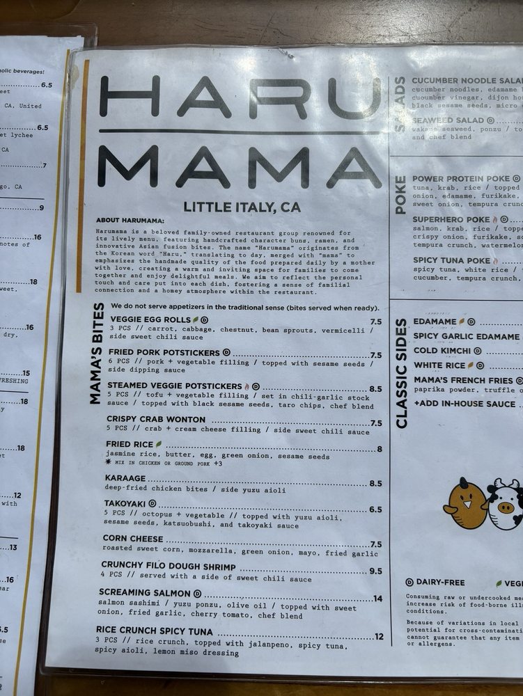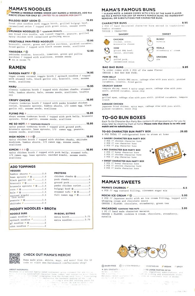 Introducing the menu at Harumama Noodles & Buns - Little Italy, a trendy and hip restaurant in San Diego. Offering a variety of options catering to different dietary preferences like soy-free, vegan, and vegetarian, this Asian-owned gem is a must-visit. From character buns to fresh sushi and flavorful udon, the menu is full of whimsical and delicious choices. Customers rave about the cute and tasty buns, like the Nutella-filled bunny and pork buns. The Power Protein Poke bowl and Cow Bao Bun are also highly recommended. The service is top-notch, making dining here a delightful experience. With an array of options for brunch, lunch, dinner, and late-night bites, Harumama is perfect for any occasion. Don't miss out on this Little Italy treasure offering a blend of fun and flavorful dishes.